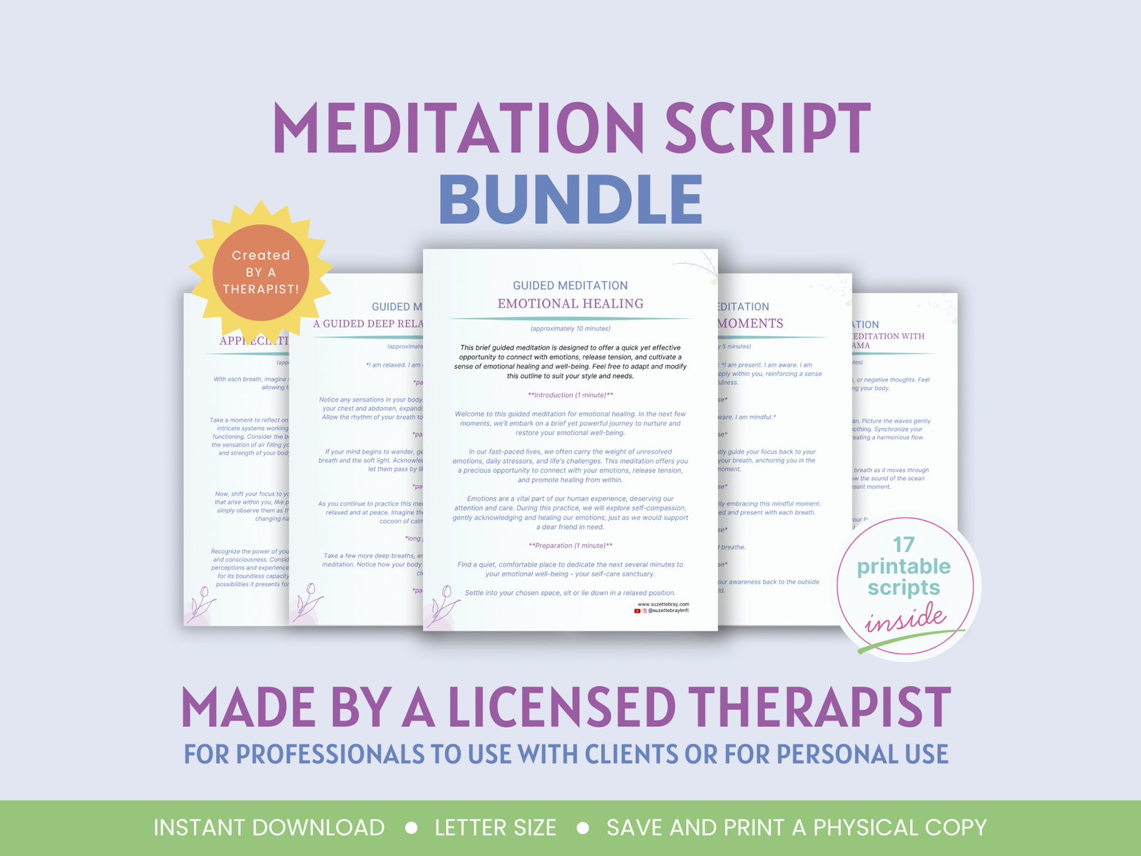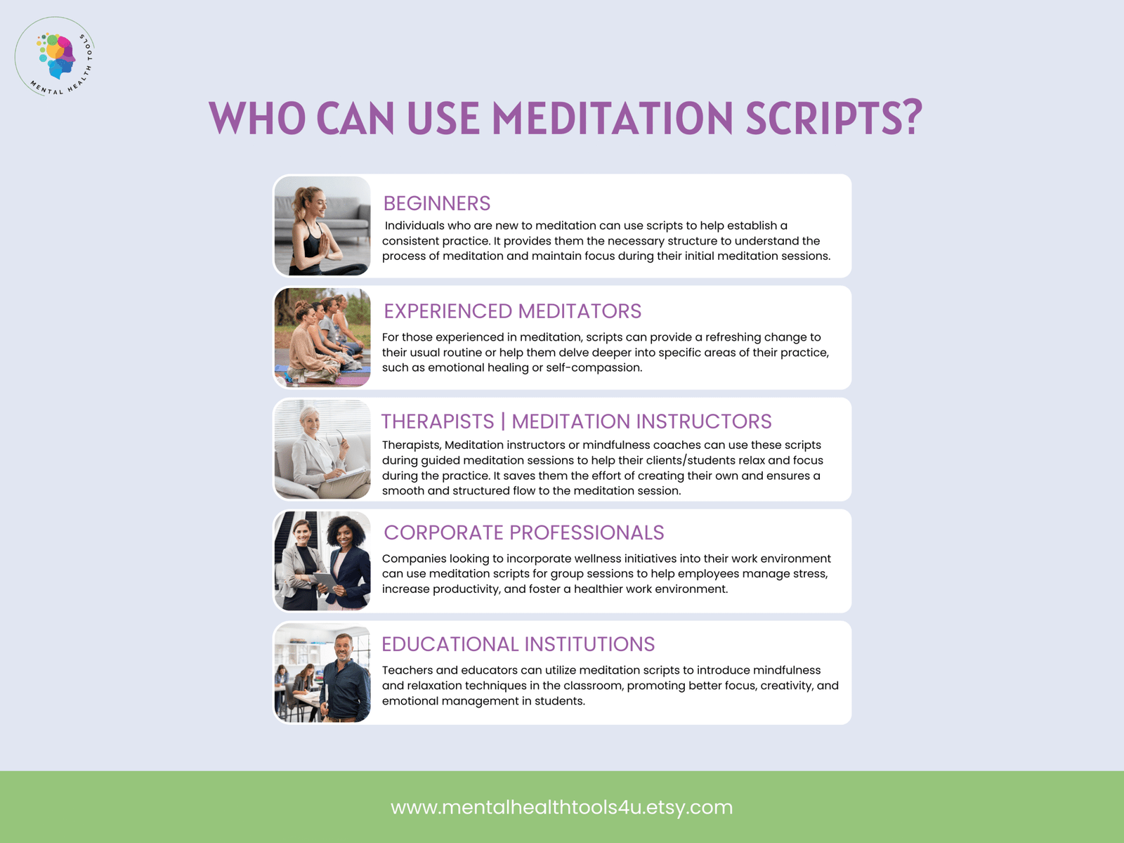 Perfect for: • Therapists & coaches seeking therapeutic meditation scripts • Mindfulness facilitators, yoga teachers & group leaders • Individuals creating a self-care or meditation routine • Anyone needing structure to stay present and grounded
